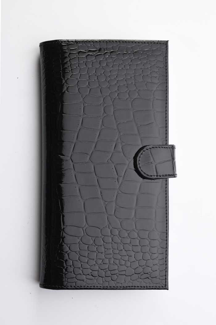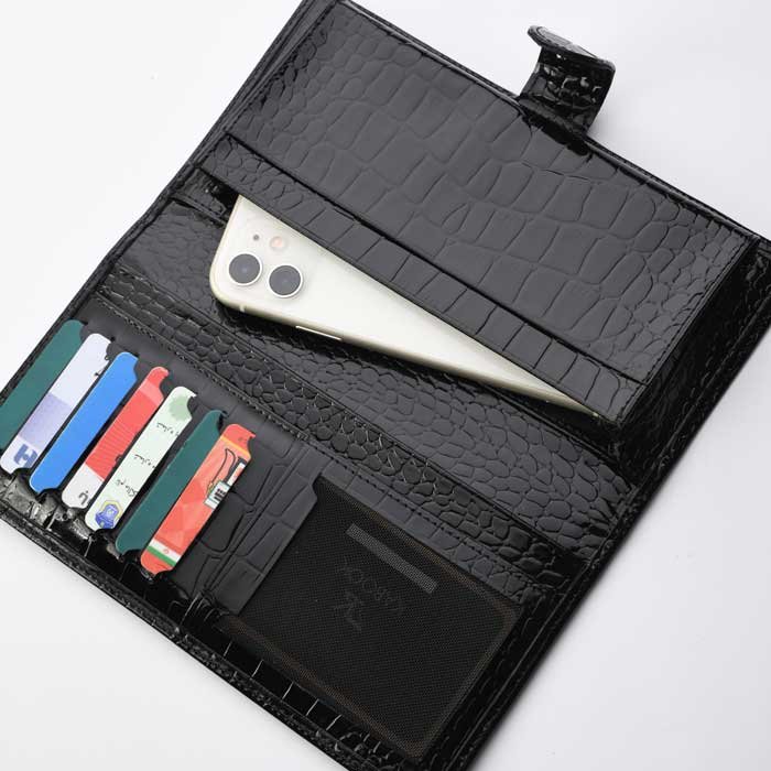 کیف موبایل استفاده شده از چرم طبیعی گاو با طرح کروکدیلی براق و دارای شناسنامه اصالت چرم