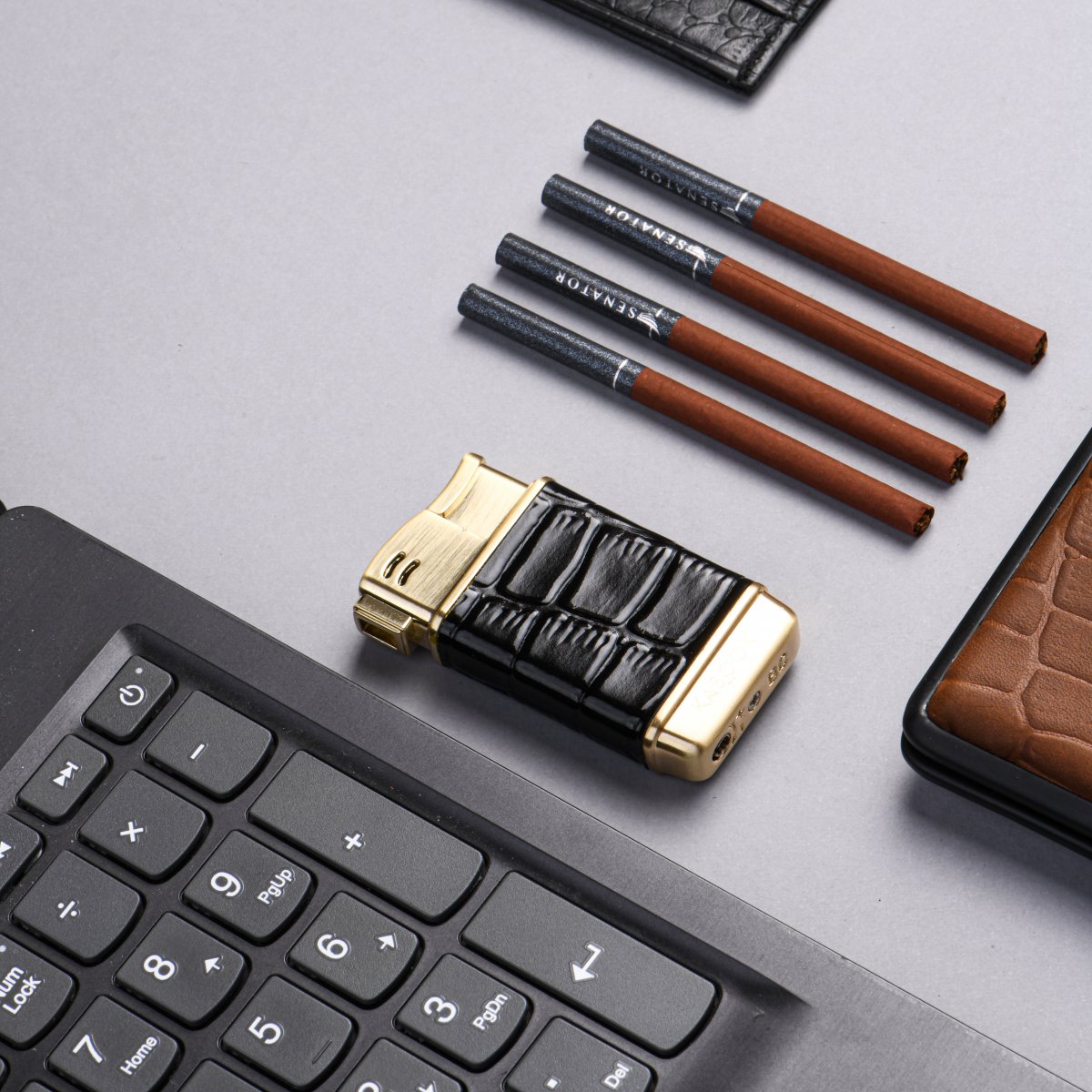 فندک گازی موجود در این ست، با بدنهای فلزی و روکش چرم طبیعی مشکی، ترکیبی از عملکرد و استایل است. این فندک با طراحی ارگونومیک و شعله قابل تنظیم، علاوه بر زیبایی، کارایی بالایی نیز ارائه میدهد. روکش چرمی آن، جلوهای لوکس و منحصربهفرد به این محصول بخشیده و آن را به گزینهای خاص برای همراه داشتن یا هدیه دادن تبدیل کرده است.