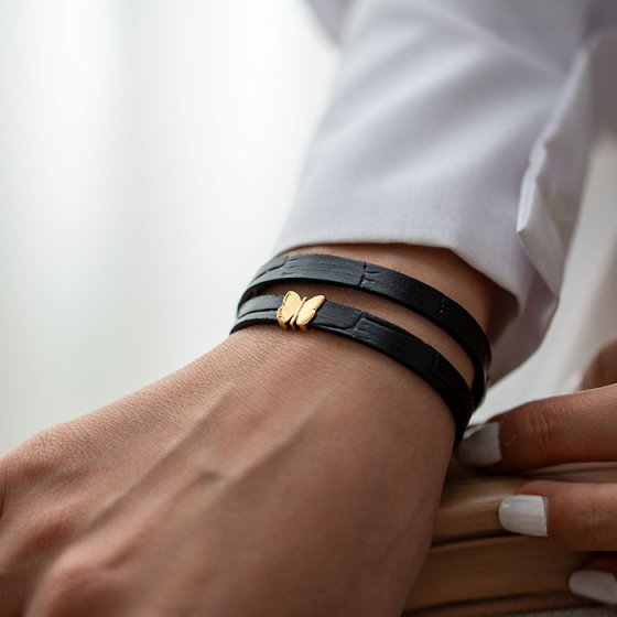 این دستبند، ترکیبی از ظرافت و زیبایی طبیعت را در قالب یک اکسسوری خاص ارائه می‌دهد. پلاک پروانه که نماد تحول، رشد و آزادی است، از طلای باکیفیت ساخته شده و جلوه‌ای شیک به این دستبند می‌بخشد. این طراحی خاص در کنار چرم طبیعی و مرغوب، استایلی منحصر به فرد ایجاد کرده و برای خانم‌هایی که به دنبال اکسسوری‌های متمایز و پرمعنا هستند، انتخابی ایده‌آل است.