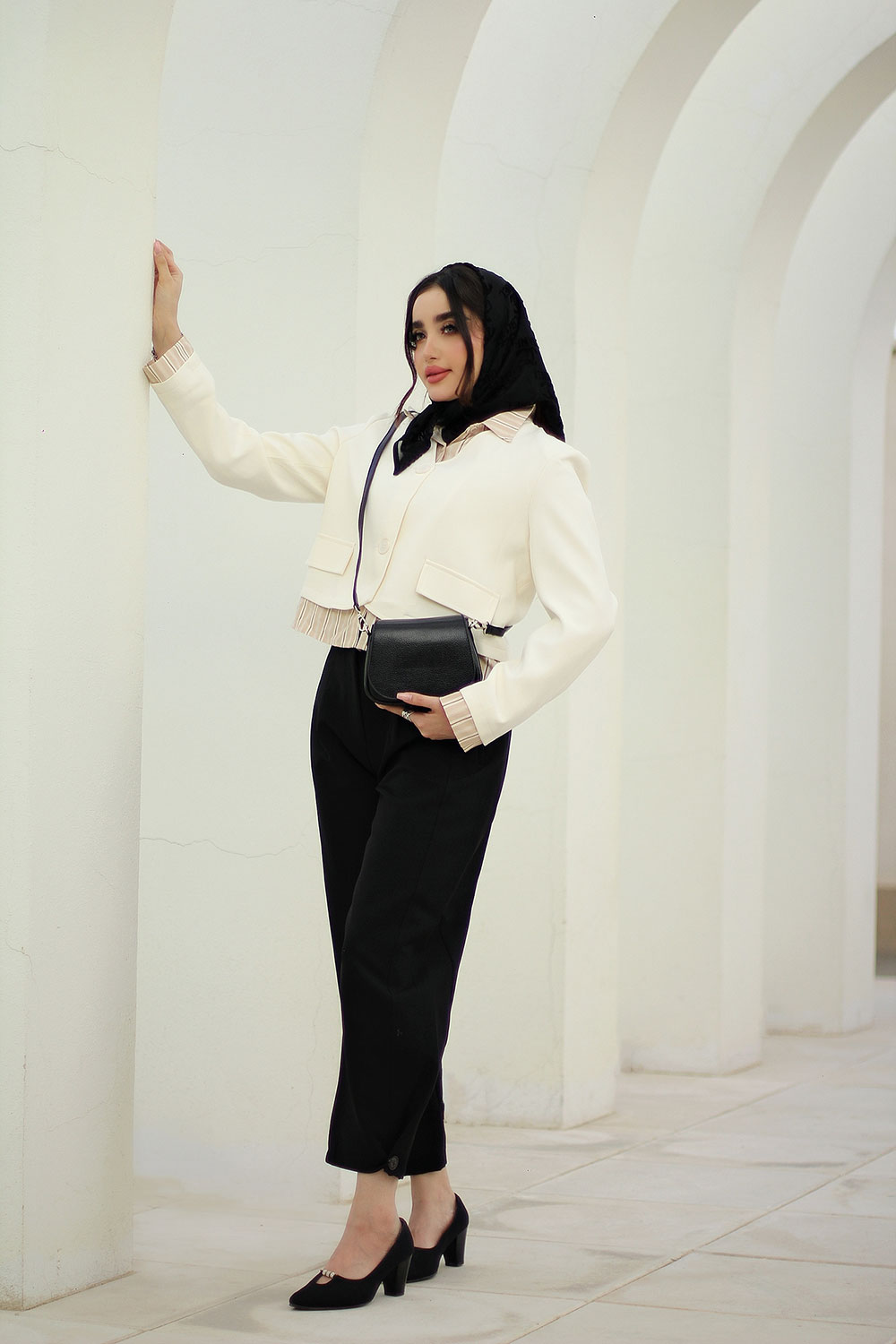 این کیف دارای یک فضای اصلی است که با قفل دکمهای مگنتدار بسته میشود. این ویژگی امنیت کیف را بالا برده و استفاده از آن را بسیار ساده میکند. در داخل فضای اصلی کیف، یک جیب کاربردی تعبیه شده است که برای قرار دادن وسایلی مانند کارتهای بانکی، موبایل یا کلیدها مناسب است. همچنین، در پشت کیف یک جیب بدون زیپ وجود دارد که دسترسی سریع به وسایل کوچک را آسانتر میکند.