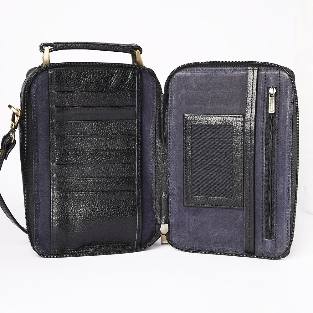 فضای داخلی فضای زیپ پشتی قابلیت باز شدن کامل دارد که 9 فضای کارت دارد- جیب زیپ دار و سه فضای اسکناس